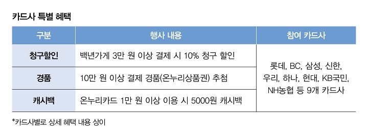 디지털온누리상품권 할인율을 5월 1일부터 5일까지 한시적으로 기존 7%에서 10%로 상향하고 9개 카드사를 통해 백년가게·전통시장·온누리가맹점 결제 시 10% 청구할인을 제공한다.