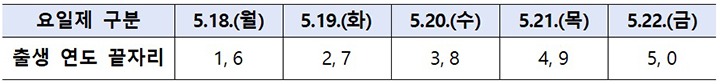다만 27일부터 이뤄지는 1차 지급의 경우 오는 5월 1일이 노동절이 공휴일로 지정됨에 따라 전날인 30일에 출생 연도 끝자리가 '4, 9' 뿐만 아니라 '5, 0'인 경우까지 신청할 수 있다.