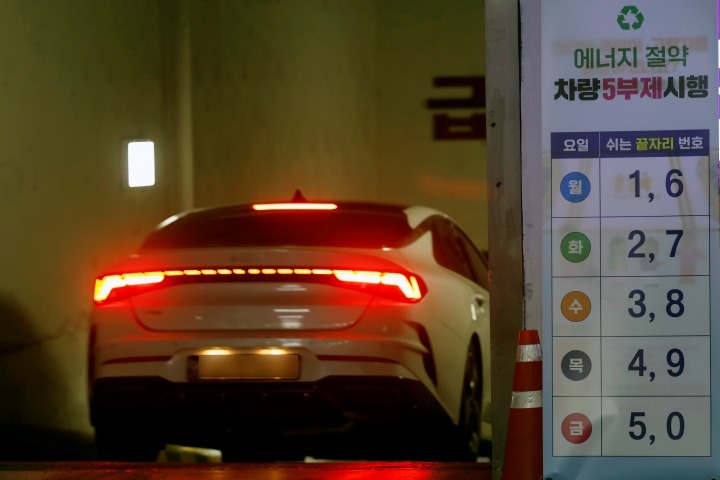 정부가 중동 상황에 따른 국제 유가 변동성 확대에 대응해 '차량 5부제 할인 특약'을 신설한 가운데 27일 서울시 종로구 세종로공영주차장에 차량 5부제 시행 안내판이 설치되어 있다.(ⓒ뉴스1, 무단 전재-재배포 금지)