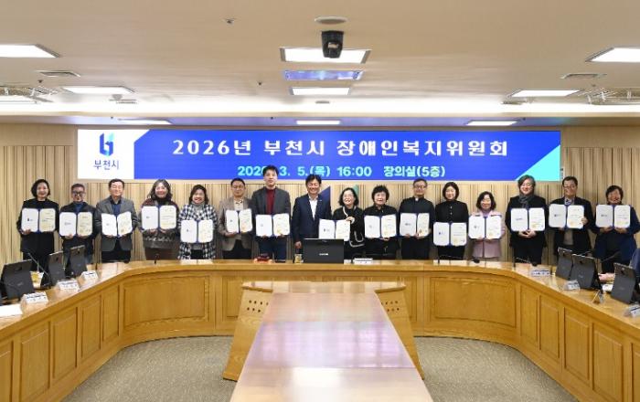 신규 위원 위촉장 수여식 참석자들이 기념 촬영을 하고 있다. [kbn연합방송=김진영 기자] 부천시는 지난 5일 시청 창의실에서 ‘2026년 제1차 부천시 장애인복지위원회’를 열고, 장애인과 가족이 체감할 수 있는 실질적 복지정책 추진을 위한 소통의 시간을 가졌