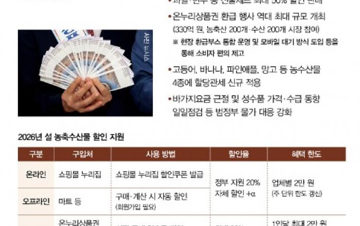[kbn연합방송=김진영 기자] 정부가 설 명절을 앞두고 민생회복과 체감경기 안정을 위해 종합 대응에 나섰다. 정부는 1월 28일 '2026년 설 민생안정대책'을 발표하고 ▲성수품 물가 안정 ▲민생 부담 경감 ▲내수 활력 제고 ▲국민 안전 확보를 4대 목표로 범