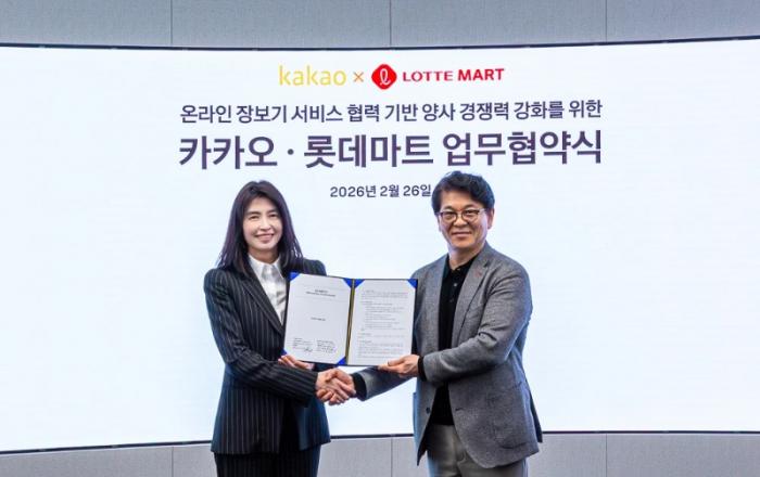 [kbn연합방송=김진영 기자] 카카오(대표이사 정신아)가 롯데마트·슈퍼(대표 차우철)와 온라인 장보기 경쟁력 강화를 위한 전략적 업무협약(MOU)을 체결했다. 연내 카카오 쇼핑에서 롯데마트와 함께 온라인 장보기 서비스를 시작한다.양사는 이번 MOU를 통해 신선식품과 배