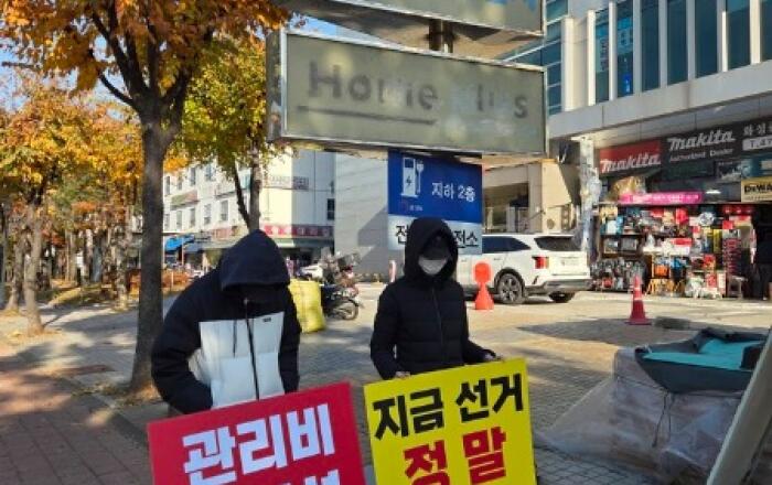 ▲ 안양국제유통상가 건너편에서 1인시위를 하고 있다.[kbn연합방송=배용완 기자] 안양국제유통단지 관리사무소 앞. 지난주부터 이어지고 있는 1인 시위 장소에는 “부당해고 책임 회피 말라”, “관리비 편법 인상