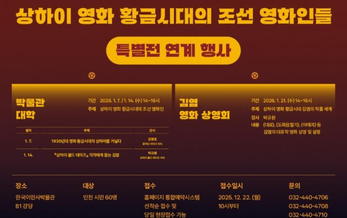 [kbn연합방송=김진영 기자] 인천광역시(시장 유정복) 시립박물관 분관 한국이민사박물관은 특별전 〈상하이 영화 황금시대의 조선 영화인들〉과 연계해 『상하이 올드 데이즈』의 저자 박규원 작가를 초청한 특강을 개최한다. 이번 특강은 일제강점기 중국으로 망명해 1930년대