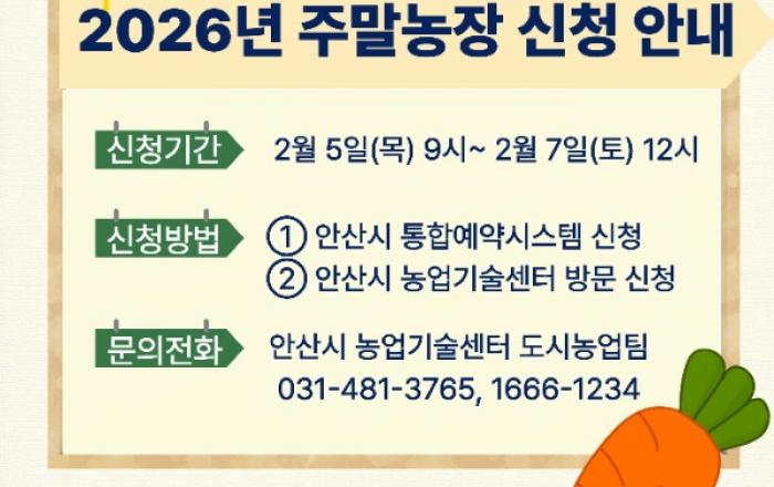 [kbn연합방송=김진영 기자] 안산시(시장 이민근)는 내달 5일부터 사흘간 주말농장 신청 및 접수를 받는다고 12일 밝혔다. 안산 주말농장은 도심 속에서 농촌의 자연 친화적 생활을 꿈꾸는 시민들을 위해 분양하고 있다.올해 주말농장은 ▲단원(신안산대학교 부근) ▲초지역(