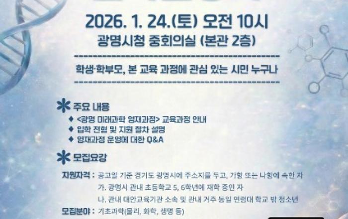 [kbn연합방송=김진영 기자] 광명시(시장 박승원)가 과학에 흥미와 잠재력을 지닌 초등학생을 대상으로 한양대학교 에리카(ERICA)와 연계한 ‘광명 미래과학 영재과정’을 운영한다고 19일 밝혔다. ‘광명 미래과학 영재과정’은 한양대 에리카 교수진이 직접 참여해 수업을