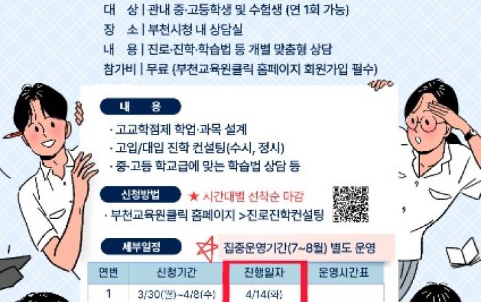 [kbn연합방송=김진영 기자] 부천시는 관내 중고등학생과 수험생의 자기주도적 진로 설계 역량을 강화하고 급변하는 입시 환경에 선제적으로 대응하기 위해 4월부터 ‘2026년 진로진학컨설팅’을 상시 운영한다.이번 컨설팅은 올해부터 부천미래교육센터가 시 직영 체제로 개편된