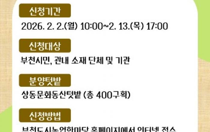 [kbn연합방송=김진영 기자] 부천시는 시민들이 텃밭 가꾸기를 통해 농업을 체험하고 자연과 공존하는 도시환경을 조성할 수 있도록 ‘2026년 도시텃밭’ 참여자를 모집한다.텃밭은 부천영상문화단지 인근 문화동산텃밭(상동 529-38 외 2필지)이며, 신청 기간은 2월 2일