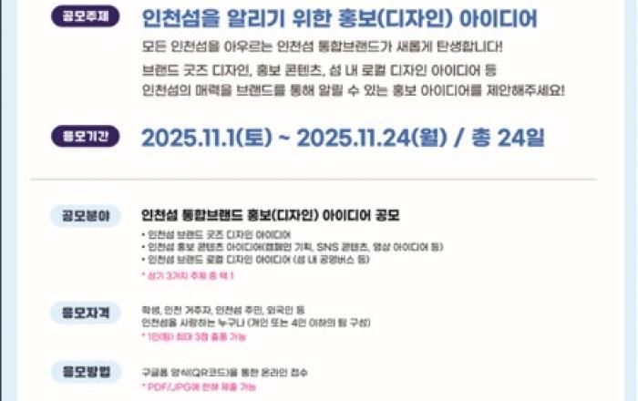 [kbn연합방송=김진영 기자] 인천광역시(시장 유정복)는 인천의 섬들이 지닌 고유한 매력과 이야기를 시민들의 창의적인 시각으로 새롭게 담아내기 위해 ‘인천섬 홍보 아이디어 공모전’을 개최한다고 밝혔다.이번 공모전은 인천섬 통합디자인 개발 및 시범사업의 일환으로 추진되며