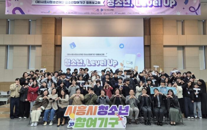15일 시흥비즈니스센터에서 열린 시흥시 청소년참여기구 활동보고회 참가자들 기념 촬영.[kbn연합방송=김진영 기자] 시흥시청소년재단은 지난 11월 15일 시흥비즈니스센터 컨벤션홀에서 2025년 시흥시 청소년참여기구 활동보고회 ‘청소년, 레벨 업(Level Up)!’을 성