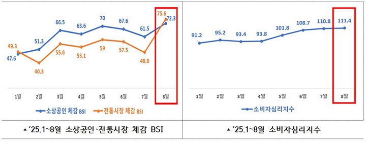 중기부·소상공인시장진흥공단이 발표한 '2025년 8월 소상공인시장 경기동향(BSI) 조사'에서도 소상공인·전통시장의 8월 체감 및 9월 전망 BSI 모두 올해 최고치를 기록했다.