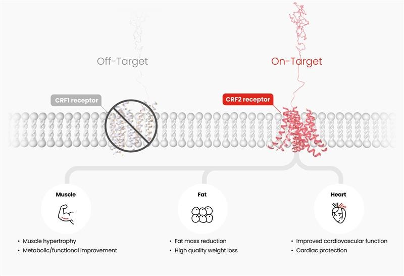 <사진> HM17321은 CRF2 수용체(On-Target)에만 선택적으로 작용해 근육 증가와 지방 감소를 동시에 유도하는 점이 특징이다. 이를 통해 근육 증대와 대사·기능 개선, 양질의 체중 감량, 심혈관 개선 효과를 동시에 기대할 수 있다.