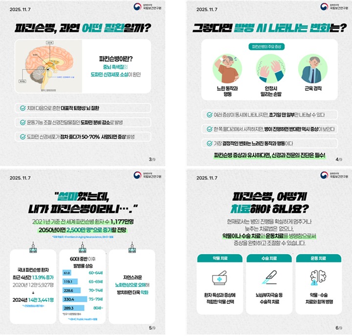 질병관리청 국립보건연구원은 9일 파킨슨병에 대한 국민 이해를 높이기 위해 '파킨슨병 바로알기' 카드뉴스를 제작·배포하고, 파킨슨병 환자 코호트 연구의 주요 성과를 공개했다.