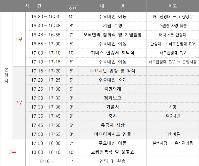 기념식은 기념주행, 점화식, 기네스 인증서 제막식 등 식전행사와 경과보고, 기념사‧축사 등 공식행사에 이어, 제3연륙교 전 구간 점등식과 불꽃쇼 등 상징적인 프로그램으로 진행됐다.