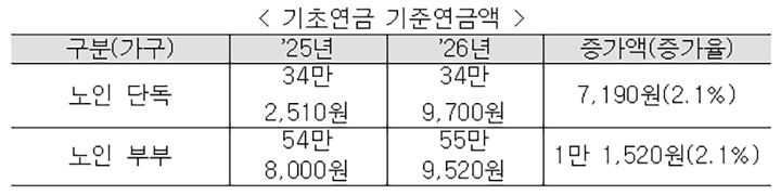 기초연금법에 따라 전년도 소비자물가상승률 2.1%를 반영해 기준연금액은 지난해 월 34만 2510원에서 올해 월 34만 9700원으로 오른다.