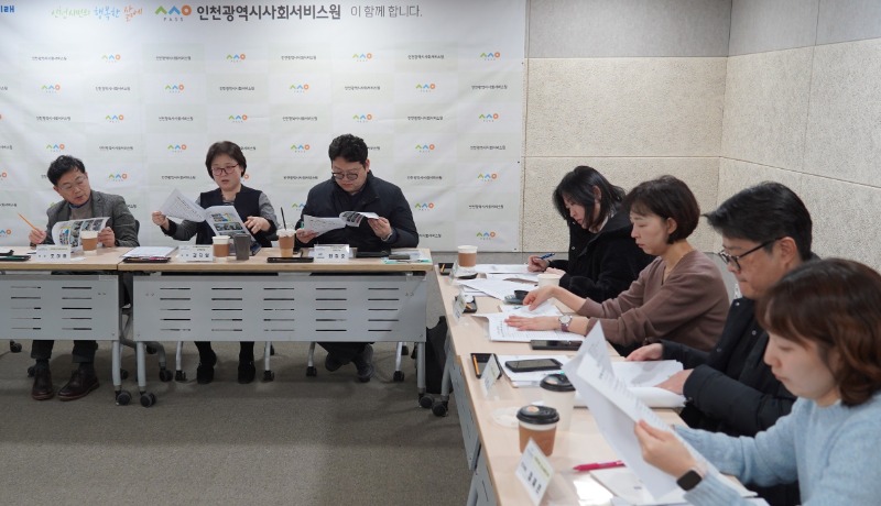 사진설명: 인천시사회서비스원은 최근 2026년 연구과제 선정을 위한 연구심의위원회를 열고 참석 위원들과 자료를 검토하고 있다.