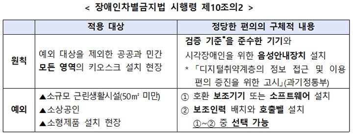 바닥면적 50㎡ 미만의 소규모 근린생활시설, '소상공인기본법'에 따른 소상공인 사업장, 테이블 주문형 소형 무인정보단말기 설치 현장의 경우에는 일반 키오스크와 호환되는 보조기기 또는 소프트웨어 설치, 보조 인력 배치와 호출벨 설치 중 하나를 선택해 이행할 수 있다.