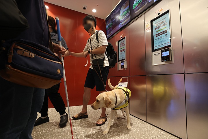 시각장애인들이 12일 서울의 한 패스트푸드점을 찾아 무인주문기(키오스크)에서 실제 주문을 해보는 '내돈내산 권리찾기 캠페인'을 하고 있다. 사진은 한 참가자가 직원의 도움으로 좌석으로 이동하는 모습. 2022.7.12 (사진=저작권자(c) 연합뉴스, 무단 전재-재배포 금지)