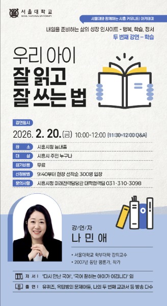 상반기에는 서울대학교 교수진이 참여하는 시민 대상 강연 프로그램 ‘시흥 커뮤니티 아카데미’를 1월부터 5월까지 총 5회(월 1회) 운영한다. 강연은 서울대학교 시흥캠퍼스 컨벤션홀과 시청 늠내홀에서 진행되며, 시흥시민은 누구나 참여할 수 있다. 2월 20일 오전 10시에는 시청 늠내홀에서 나민애 서울대학교 교수의 강연 ‘우리 아이 잘 읽고 잘 쓰는 법’이 진행된다.