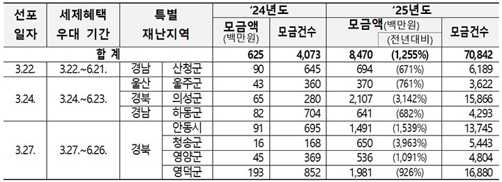 특히 영덕군의 경우 인구가 3만 명 대에 불과함에도 주민 수 기준 평균 모금액이 11만 원을 상회했다.