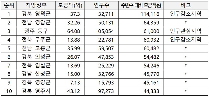 이밖에 광주 동구, 경북 영주시, 경북 영덕군, 전남 영암군은 모금액 상위 10개 기초지방정부에도 해당하면서 주민 수 대비 평균 모금액 역시 상위 10위권에 속했다.
