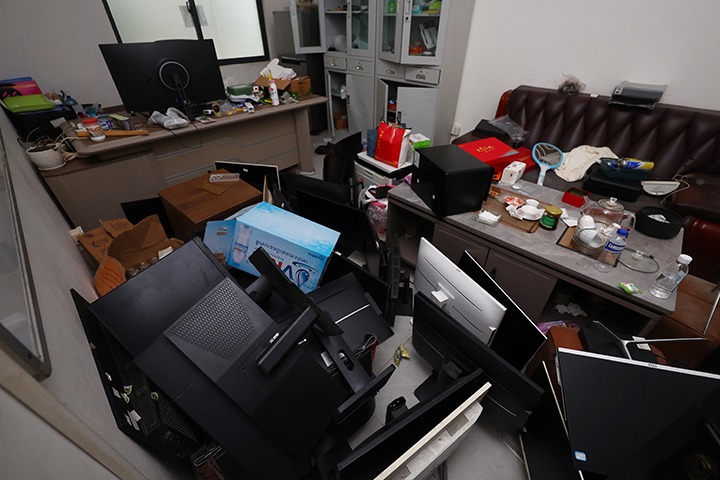 23일(현지시간) 캄보디아 범죄단지인 '태자단지' 내부에 컴퓨터 본체와 모니터들이 방치돼 있다. 2025.10.23 (사진=저작권자(c) 연합뉴스, 무단 전재-재배포 금지)