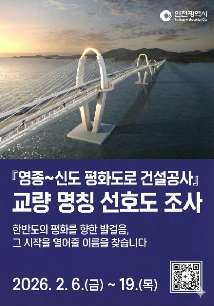시민 선호도 조사는 2월 6일부터 2월 19일까지 14일간 인천시 누리집을 통해 온라인으로 진행된다. 주요 명칭 후보는 ▲사업의 상징성을 담은 ‘서해남북평화대교’ ▲교량의 시·종점을 결합해 위치를 직관적으로 알 수 있는 ‘신도영종대교’ ▲지역 주민의 염원과 평화의 가치를 강조한 ‘신도평화대교’ 등 3개 안이며, 시민들은 후보 안 중 하나를 선택하거나 새로운 명칭을 직접 제안할 수 있다.