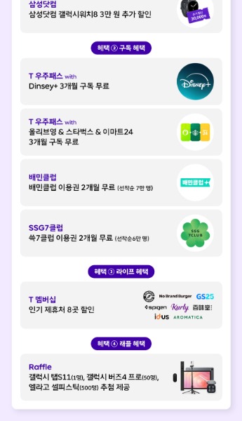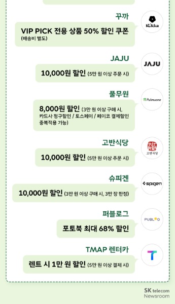 3월 T day 혜택도 다채롭게 마련됐다. 요기요xbhc 치킨 할인, 설빙 35% 할인, VIPS 40% 할인 및적립 혜택을 비롯해, 더벤티 아이스 아메리카노 50% 할인, 베베쿡과 톤28 할인까지 폭넓은 혜택을 만나볼 수 있다.