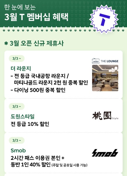 3월에는 다양한 신규 제휴처가 T 멤버십에 추가된다. 여행의 휴식을 더해주는 공항라운지 ‘더라운지’, 중식당 도원의 세컨드 브랜드 ‘도원스타일’, 새로운 차원의 실내 스포츠 테마파크 ‘Smob’, 베이비&키즈 브랜드 쇼핑몰 ‘키디키디몰’이 새롭게 합류했으며, ‘박신양의 전시쑈’ 입장권 할인 이벤트도 3월 10일부터 5월 10일까지 진행된다.