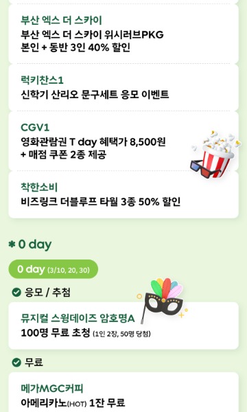 0 day 혜택도 알차게 구성됐다. 뮤지컬 ‘스윙데이즈 암호명A’ 초청 이벤트를 통해 총 100명을 무료로 초대한다. 메가 MGC커피 따뜻한 아메리카노 1잔, 백억커피 아메리카노 1잔과 서비스 팝콘도 무료로 제공된다. 도미노피자, 롤링파스타, Smob, JAJU 할인 프로모션도 운영된다.