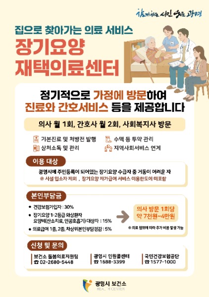 자세한 사항은 광명시 민원콜센터(1688-3399), 광명시보건소 돌봄의료지원팀(02-2680-5448), 각 동 행정복지센터로 문의하면 안내받을 수 있다.