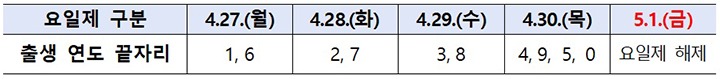 다만 27일부터 이뤄지는 1차 지급의 경우 오는 5월 1일이 노동절이 공휴일로 지정됨에 따라 전날인 30일에 출생 연도 끝자리가 '4, 9' 뿐만 아니라 '5, 0'인 경우까지 신청할 수 있다.
